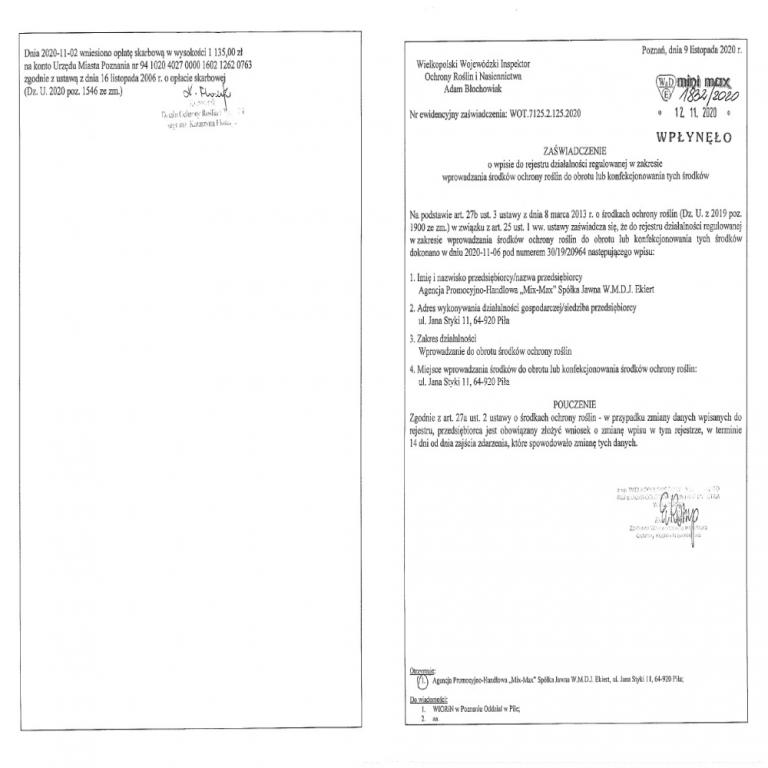 Sprzedający posiada zaświadczenie o wpisie do rejestru działalności regulowanej w zakresie wprowadzania środków ochrony roślin do obrotu lub konfekcjonowania tych środków nr 30/19/20964 z dnia 2020-11-06